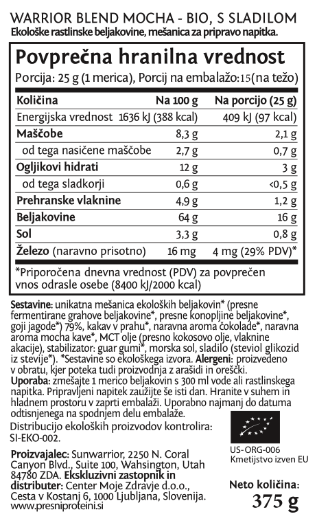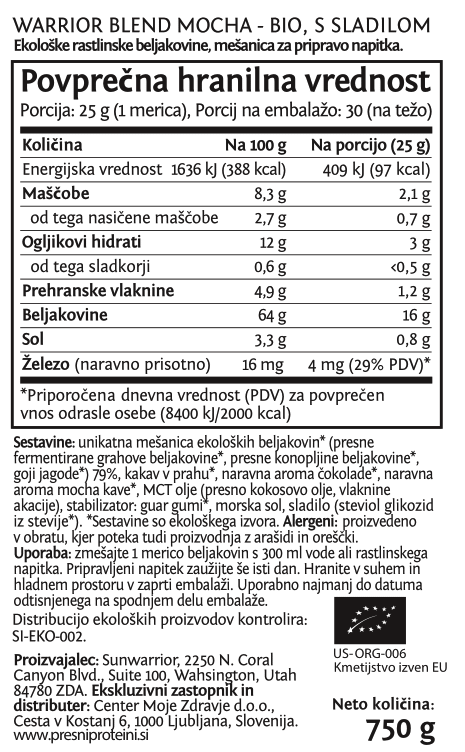 Deklaracija – Sunwarrior Warrior Blend rastlinski proteini – Mocha, 750 g: