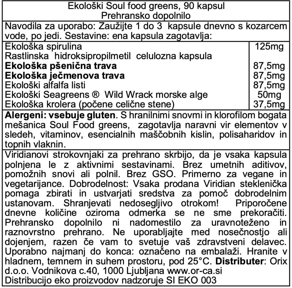 Deklaracija – Viridian Ekološko Soul Food zelenje v prahu, 90 kapsul: